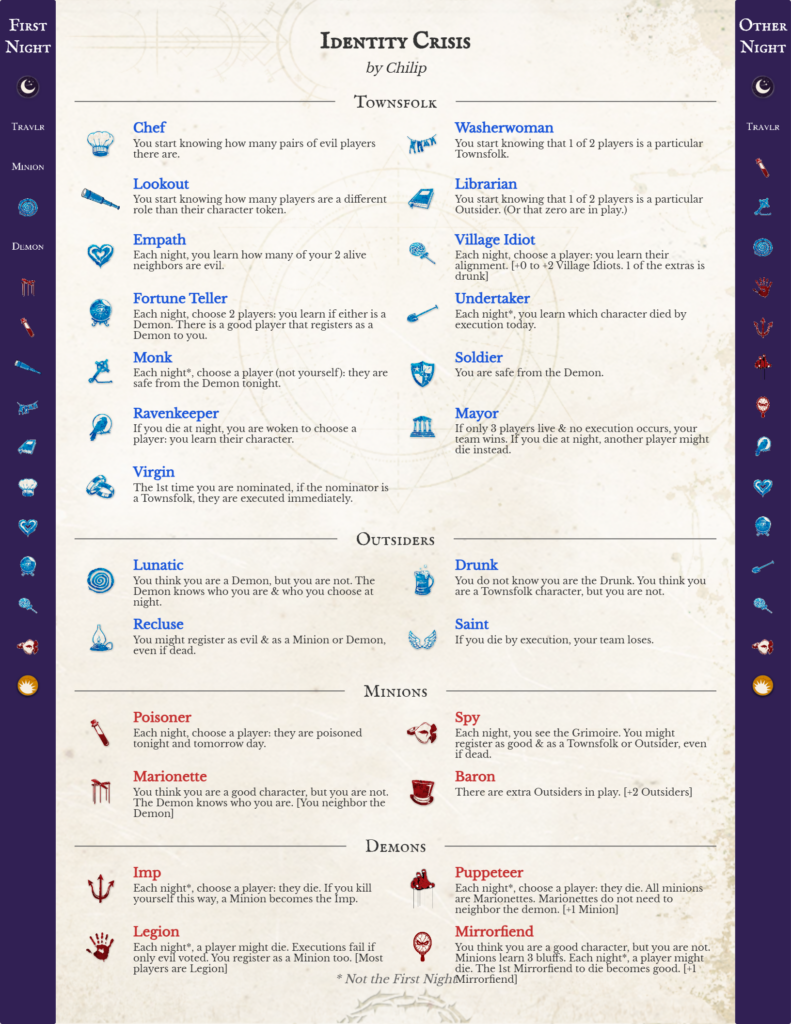 The core concept of the script is to have multiple roles that think they are certain characters but are not. Figuring out players’ true identities can pose some interesting puzzles to solve.